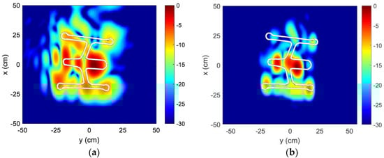 It is worth noting that even after fine motion compensation, there are still some out-of-body features in both and dimensions. The former, which extends beyond the drone (in down-range), is likely due to multiple scattering effects. The latter, along the cross-range dimension, may be due to the drone flight not fully following the motion model over the 78° angular swath. In Figure 12a, by narrowing the angular swath to 55° (−22° to +33° in this case), we can reduce the amount of out-of-body features along the -dimension. For comparison, the image based on laboratory turntable data for another Inspire 1 drone [46], using a 55° angular swath with a signal bandwidth from 3.1 to 5.3 GHz, is shown in Figure 12b. By comparing Figure 12a,b, we see that the main body features are present in both images: Drone battery pack, camera, and cross-bars. The 4 motors that sit at the end of the cross-bars are also visible. It is worth noting that the target image in Figure 12b looks smaller than that in Figure 12a. This could be because the drone has a larger geometrical footprint when in flight than when it is in landing mode (during laboratory measurement). The white geometrical outline is of the drone in landing mode.