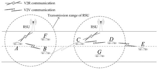 VANET is a special mobile ad hoc network (MANET) that has special characteristics compared with mobile ad hoc networks such as highly dynamic topologies, frequently disconnected links, restricted moving directions (which effected by the direction of the road, traffic lights, etc.) and without restrictions for energy and storage [,]. Vehicles in VANET can communicate with other vehicles via the On-Board Unit (OBU) and can also communicate with the RoadSide Unit (RSU) via the OBU [].