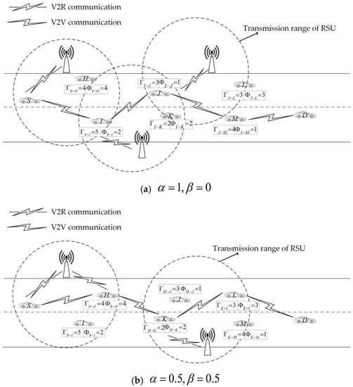 Cooperation formation phase: as shown in Figure 1, we assume that node A needs to send a message to node E. Since node E is not in the communication range of node A, it is necessary to construct a multi-hop communication link from node A to node E. In the communication range of node A, there are node B and node E. Node A acquires of node B and of node E through the adjacent RSU and simultaneously calculates the that may be obtained, then calculates that may be obtained by cooperation with node B and node E respectively according to , and . At last, node A determines which node to cooperate based on . In Figure 1, node A finally selects node B as its next hop. Node B repeats this phase until destination node E is within its communication range.