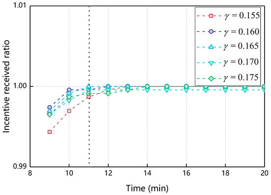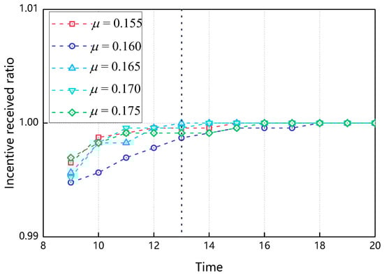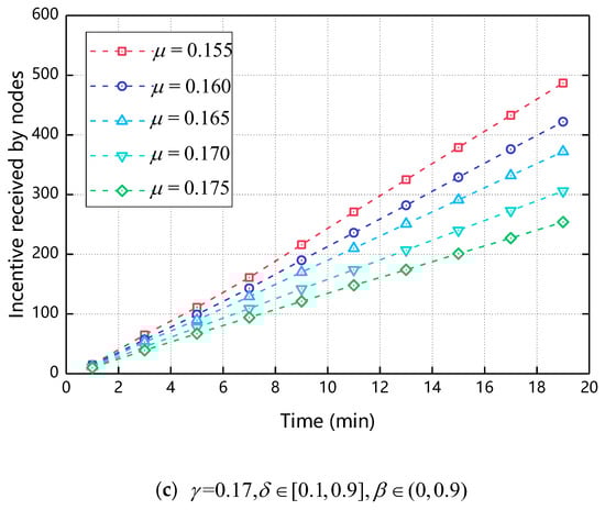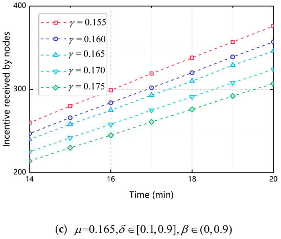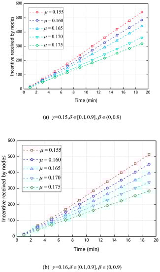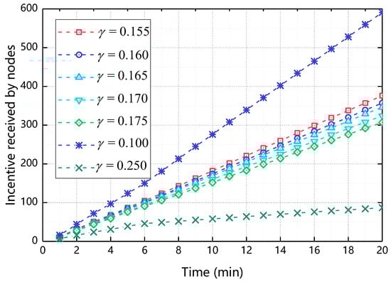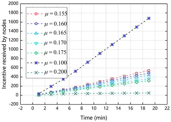 Figure 7 shows the relationship between the incentive received by nodes and the time when changes. As shown in Figure 7, when increases, the final incentive value of the node decreases. This is because when increases, the greater the impact of cooperative behavior on , the resulting reciprocal cooperation costs will increase accordingly, making the ultimate node’s incentive reduced. Compared with Figure 4, as increases, the final incentive change of the node is less. This is because only effects of the node and the resulting reciprocal cooperation cost is less than the total cost of cooperation, so the degree of change is relatively small compared to Figure 4 We determine the range of values of is [0.165, 0.175] by Figure 6. The specific values of are discussed in the next section.