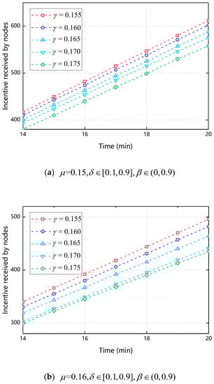 Before we discuss the value of in detail, let’s discuss the appropriate range of . As shown in Figure 6, when gradually increases from 0.1 to 0.25, the incentive received by nodes decreases rapidly. When = 0.1, the incentive received by nodes reaches about 600 and when = 0.25, the incentive received by nodes is less than 100, incentive received by nodes becomes too large or too small will reduce the enthusiasm of node participation, thus we mainly discuss the situation when takes 0.155~0.175.