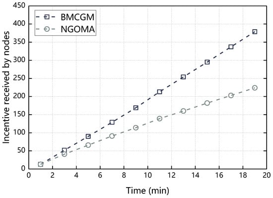 Figure 10 compares the difference between the BMCGM and NGOMA in the aspect of incentive received by nodes. As can be seen from Figure 10, as the experimental running time increases, incentive received by nodes increase in BMCGM and NGOMA with the nodes participate in cooperation. While node’s incentive in BMCGM is greater than the node’s incentive in NGOMA, this is because in NGOMA, only the influence of on the choice of node behavior is considered and the node only cooperates in the case of maximizing its own . In the BMCGM, the reciprocal altruistic of the node is considered. Compared to the traditional message cooperation transmission mechanism, nodes are more likely to achieve cooperative behavior, so nodes in BMCGM received more incentive than NGOMA.