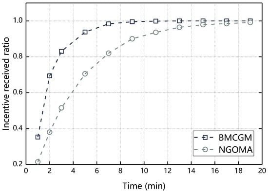 Figure 11 compares the difference between the BMCGM and NGOMA in the aspect of incentive received ratio. It can be seen from Figure 9 that incentive received ratios of the two algorithms increase with time and the growth in the early part of the experiment is faster and the latter part increases slowly and finally reaches 1. This is because, assume that there are nodes in the network, the nodes randomly send messages to each other and the message is sent from the source node to the destination node through one or more relay nodes. Suppose that there are nodes participate in the message cooperative transmission after the th random interaction, then the proportion of nodes that have not obtained incentive after the interaction is . When the ()th interaction starts, it is obvious that if the value of is larger, the proportion of nodes that have not participated in the cooperation before is smaller, so the growth in the early part of the experiment is faster and the latter part increases slowly. At the same time, it can be seen from Figure 11, BMCGM’s incentive received ratio grows faster than the NGOMA and reaches 1 in 11 min. This is because, in the case of considering the reciprocal altruistic of nodes, the node is more willing to cooperate.