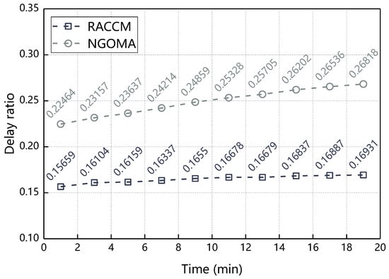 Delay refers to the time taken for the message to be sent from the source node to the destination node. The delay ratio in this section refers to the ratio of delay to the current running time. Figure 12 comparing the performance difference between BMCGM and NGOMA in delay ratio. As can be seen from the figure, both the BMCGM and NGOMA delay ratio increase with time but the BMCGM delay ratio is smaller than the NGOMA delay ratio, this is because in BMCGM, of nodes with altruistic reciprocal attributes is higher than the self-interested nodes assumed in the traditional message cooperative transmission mechanism. In NGOMA, when the source node and the node around the destination node cannot maximize their own incentive by cooperating transmit messages, they will not choose cooperation. In BMCGM, the node with the altruistic reciprocal attribute will be affected by and the cooperation behavior will be selected. The cooperative behavior that cannot be achieved in NGOMA can be reached in BMCGM, thus reduces the delay ratio, so BMCGM has a lower delay ratio than NGOMA.