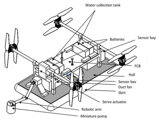The conceptual model is formulated by integrating the multirotor and hovercraft configurations wherein four co-axial propellers and motors that are attached to the frame act as an octo-rotor as shown in Figure 1. The entire rotor assembly is supported by a hull made of high-density polyurethane foam, and nylon impregnated with urethane is attached beneath for functioning as a skirt. Provision for payloads, batteries, sensors, electronic accessories, flight controller board (FCB), water sampler with robotic arm module, and water collection tanks are made in such a way that the center of gravity (CG) of the vehicle is maintained for stable flight.