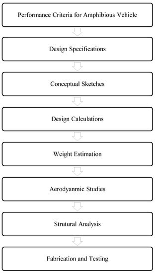 Design process of the amphibious vehicle capturing the functionalities corresponding to aerodynamics, structures, and compliance to performance criteria is presented in Figure 2.
