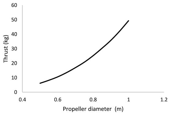The weight of amphibious system was considered to be 30 kg for selection of the propellers. A Quad with a co-axial motor–propeller configuration was considered due to the demand of high payload-carrying capacity and stability of the vehicle. Considering the thrust to weight ratio as 2% and a 20% thrust loss due to the co-axial configuration, the maximum thrust was estimated as 75 kg. Under the full-throttle condition, propellers of various diameters and their thrust force [27] characteristics were examined (Figure 3). In order to lift 75 kg, each co-axial arm needed to produce approximately 18.5 kg of thrust. Hence, a co-axial propeller configuration with diameter 0.75–0.80 m was selected.