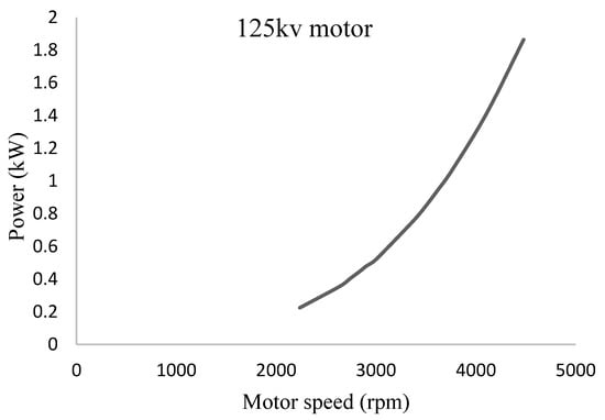 Selection of the motor primarily depends upon the size of the propeller for generating sufficient thrust, and the selected configuration demands 10 kg thrust force per motor. Power consumption of the 125 kv motor under various speeds was determined as shown in Figure 4. Under a full-throttle condition, a maximum power of 1.86 kW is required per each motor at a speed of 4480 rpm.