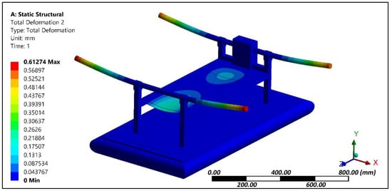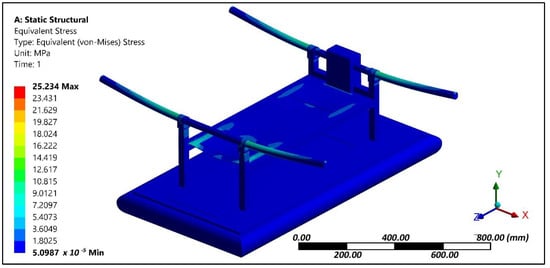 The multirotor configuration had vertical and horizontal frames that were made of aluminium channels owing to its lightweight characteristics. At the tip of the horizontal frames, the motor and co-axial propellers were attached. The vertical frames were anchored to the top surface of the hovercraft hull. The thrust produced by the propellers [29,30,31] was considered to be acting at the fixed support of horizontal frame and the same vertical axial loading was applied at the four corners of the horizontal frame. An axial load was applied at the tip of the frame and the effect of cushion pressure generated through the duct fan located at the center of hull was analyzed. The pressure load was applied at the inner surface of the skirt and bottom of the hull. The effect of these loading conditions was evaluated through structural analysis. A displacement of 0.6 mm was experienced at the tip of horizontal frame (Figure 5). The von Mises stress plot (Figure 6) shows that the junction of horizontal and vertical frames experiences maximum stress regions about 25 MPa. Other portions of the amphibious structure experienced considerably lower levels of stress.