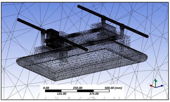 Aerodynamic evaluation of the amphibious vehicle was performed through varying the wind speeds in the range of 5 to 10 m/s with different angles of attack (AOA) (0° and 8°). Computational fluid dynamic (CFD) analysis using the ANSYS FLUENT platform (ANSYS, Canonsburg, PA, USA) was used to examine the velocity and pressure contours during forward flight conditions, and aerodynamic coefficients were also determined. The quality of meshing (Figure 7) is evaluated through performing orthogonality and skewness characteristics (0.9). Inlet as velocity and outlet as a pressure was considered and boundaries were defined far away (10 times) to reduce the horizontal buoyancy effect and wall inference. A symmetric plane and no heat transfer were assumed to perform simulations.