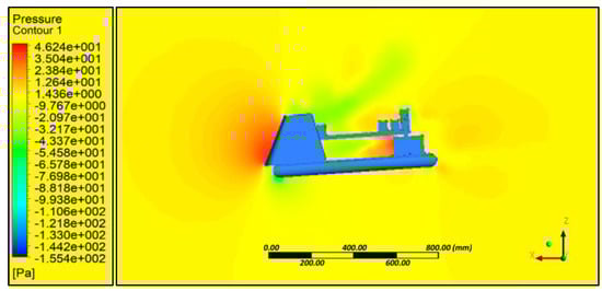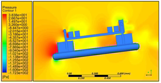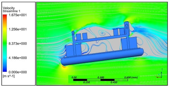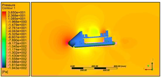 Simulation results indicated that at various angles of attack, collision of air with the frontal body surface caused a velocity drop (Figure 8) due to stagnation pressure (Figure 9), and there was a loss of kinetic energy. At the middle of the amphibious vehicle, a low-pressure region formed that created vortex and flow separation. This phenomenon may have created an imbalance of the vehicle, which can be streamlined through providing riblets. At the rear of the vehicle, recirculation flow occurred due to non-uniformity and a blunt profile of the UAV structure.
