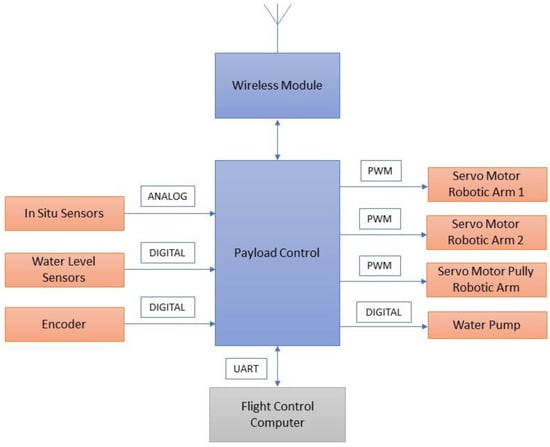 Figure 13 illustrates the payload control unit, in which pulse-width modulated (PWM) signals were sent to actuate the servo motors. The water level sensors, water quality monitoring sensors, pump, and encoder were used to provide feedback in analog and digital forms.
