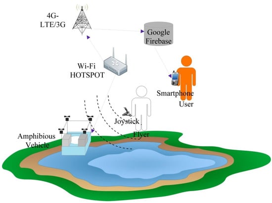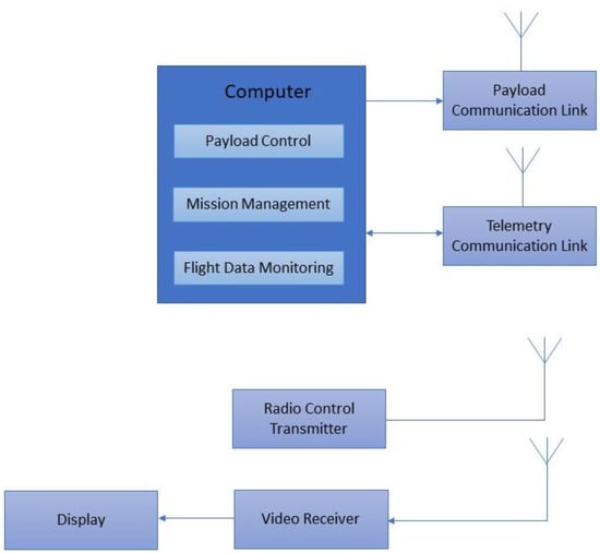 The ground control station (Figure 14) consisted of a portable computer with payload control, mission management, and flight data monitoring with corresponding communication links. The mission of the amphibious vehicle was pre-planned in the ground control station wherein the vehicle was flown as multi-rotor to identify contaminated regions of the waterbody and on-line video was streamed using a 5.8 GHz video data link. Once contaminated regions are identified, the vehicle was landed on the water surface through the hovercraft mode. Water samples were collected using a robotic arm with suction pump and rope mechanism structure. Radio frequency signals in universal asynchronous receiver—transmitter (UART) carrier mode were used to communicate and actuate the servos, sensors, and other actuators to collect required water samples with precise feedback.