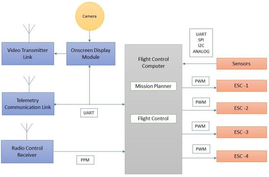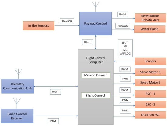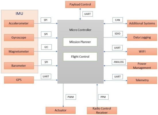 A typical flight control computer [32] is presented in Figure 15. It acted as the central hub of the system through which position, orientation, and heading direction of the vehicle were controlled. In addition, the receiving and transmission of data, battery power monitoring, and actuation of servos, motors, and the robotic arm were performed.