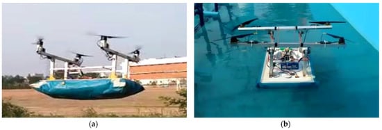 Unmanned aerial vehicles (UAVs) are categorized based on the performance characteristics of their wing movement such as fixed-wing, rotary, and flapping-wing configurations [1]. Various applications of UAVs include surveillance, traffic monitoring, active weapon engagement, wildlife surveying, pollution monitoring, precision agriculture, etc. [2]. Authors of this paper contributed to the development of UAVs for environmental monitoring [3], structural health monitoring [4], and also constructed micro aerial vehicles [5,6,7]. Dedicated efforts on the development of amphibious vehicles are scarce. Collins [8] described the importance of amphibious UAV in diverse applications and discussed their relevance in issues pertaining to control, communication, and airspace management. Boxerbaum et al. [9] developed a robotic amphibious vehicle using biological concepts inspired by animals to navigate in underwater and rough terrains. Yayla et al. [10] performed theoretical analysis to investigate the performance characteristics such as rate-of-climb, turn radius, and maximum velocity of an amphibious UAV. Pisanich and Morris [11] fabricated a sea plane conceptual model of an amphibious UAV for a 4 kg payload. Autonomous flight missions were performed in air and water as a proof of concept. Hasnan and Wahab [12] designed a UAV that can fly in air, and glide along land and a water surface. Frejek and Nokleby [13] designed a four-paddle-wheel amphibious vehicle with ultrasonic sensors to detect obstacles. The published data indicates that development of amphibious UAVs for deployment in water quality assessment is not evident from the literature. Measurement of water quality is usually performed with the aid of boats [14], which is labor-intensive and costly. Remote sensing methods of water quality assessment is time-consuming and needs lot of investment [15]. Traditionally, water body agencies are collecting the water samples manually and in a periodic manner, which is cumbersome [16]. Few of the lakes, rivers, ponds, and reservoirs may not have access to collect water samples with boats and they might be surrounded with shrubs and bushes [17]. Also, in situ measurement of water quality at the designated locations of water bodies and periodic measurement are of paramount interest to address the water quality [18]. An autonomous underwater vehicle is deployed [19] and it suffers due to the global positioning system (GPS) denied environment and controlling of those vehicles are difficult to collect water samples at the precise water location. In order to overcome the aforementioned difficulties, a radical approach in collecting water samples and performing in situ water quality assessment is necessary. UAV-based water quality can be a relatively inexpensive, easy, and effective approach in accessing the large water bodies in a short span of time. Landing of vehicles in dangerous water locations where human threat is of major concern and inaccessible water bodies with boats are effortlessly accessed with the aid of UAVs. Also, moving along the water body may be of peculiar interest to consume less power that necessitate UAV with amphibious characteristics. For quality evaluation of large and inaccessible water bodies, amphibious vehicles provide effective and rapid solutions. Development of a UAV that can land and glide on the water’s surface while collecting water samples offers several challenges related to materials, energy management, control systems, and on-board sensors. The present study integrates features of a multi-rotor UAV with a hovercraft and this configuration for an amphibious UAV has not been attempted yet. The vertical take-off and landing (VTOL) functionality is also integrated into the system so that the resultant amphibious vehicle offers several functional advantages, such as energy efficient movement on the water’s surface, eliminating large areas for landing and take-off besides ensuring compatibility with a wide variety of payloads.