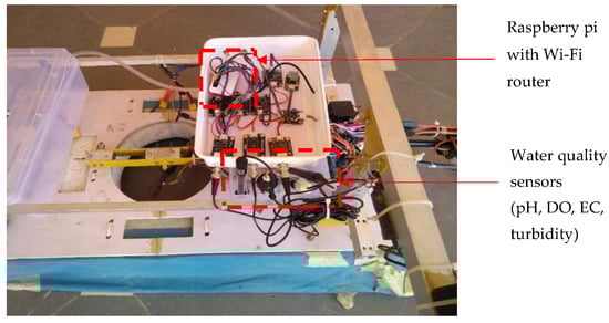 It is essential to perform water quality inspection at regular intervals at the water reservoirs such as dams, lakes, rivers, and ponds. Collection of water samples in remote water bodies is challenging and time consuming. Traditional methods of collecting water samples using boats is cumbersome and it is very difficult to access remote water locations. In this work, we developed an amphibian vehicle that can measure the water quality using various on-board water quality sensors such as pH, dissolved oxygen (DO), electrical conductivity (EC), temperature, and turbidity, and they were procured. A Raspberry pi zero BCM 2835, 1 GHz ARM 11 core, 512 MB of LPDDR2 SDRAM (Raspberry PI Foundation, Cambridge. UK) was utilized to process the sensor data and sent via a 4G dongle-LTE network at 2300 MHz. The IoT setup shown in Figure 20 was embedded into the designed amphibious UAV and in situ water quality measurements were performed. The sensor data were sampled at a 160 MHz sampling speed using an Arduino pro mini and transmitted to the Raspberry pi UART section. The Raspberry pi was connected with a 4G-LTE dongle, and the UAV was operated with a 2.4 GHz radio frequency to avoid inference.