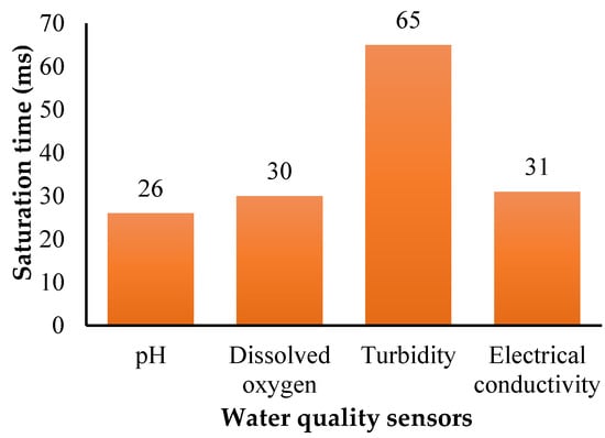 The ARM-based computer processed the sensor data and provided the useful information for measurable quantities in standard units. The water quality information was transferred to the cloud database for real-time monitoring and post-processing. The link between the cloud data base server and real-time on-board embedded computer were created with the 4G broadband cellular network because it provided better speed in comparison to 2G and 3G. The water quality data in the cloud could be accessed through the smart devices with an Internet service anywhere in the world. Preliminary experiments were conducted to examine the performance characteristics of the sensor network. The saturation time taken for each sensor was obtained and turbidity took more time to arrive at saturation in comparison with other sensors, as shown in Figure 22.