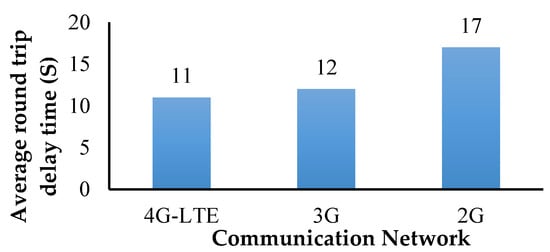 The average delay (500 set transmissions) in water quality data was monitored with different network conditions (4G, 3G, and 2G). The round-trip delay time seemed to be better for 4G-LTE communication, and it took 11 s on average to reach the destination (Figure 23).
