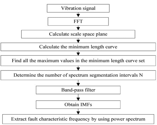 Firstly, the Fourier transform of the original function and the sampled Gaussian kernel function are convoluted in order to obtain the scale space representation. Secondly, in the calculation process, with the increasing of the scale t, the scale space curve is obtained. Then, the position of the local minimum is determined in turn at t = 0. From the starting points of these positions, the scale space curves are sequentially accumulated under different scales () in order to obtain the minimum length curves . The final difference between scale space representation method and maximum-minimum length curve is that the problem is converted to calculate all the maximum thresholds of the minimum length curve in the scale space representation set , then the boundaries are determined by detecting the local minimum value. The number N of the obtained maximum threshold by calculating is defined as the number of spectrum segmentation. The flow of the MSCEWT method is shown in Figure 3. The specific steps of the MSCEWT method are described as follows: