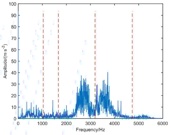The inner race fault vibration signal of motor bearing is selected to verify the effectiveness of the improved scale space representation method. The spectrum segmentation and power spectrum of the inner race vibration signal of the motor bearing are shown in Figure 5 and Figure 6, respectively. The power spectrum results of scale space representation (SSR) and modified scale space representation based on maximum-minimum length curve (MSSR) are compared in Table 2.