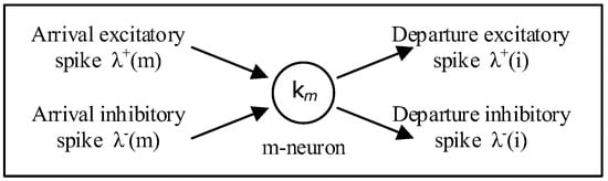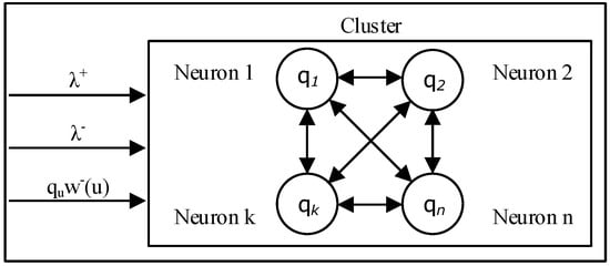 Deep Learning Clusters with RNN is described by Gelenbe, E. and Yin, Y. [38,39]. This model is based on the generalized queuing networks with triggered customer movement (G-networks) where customers are either “positive” or “negative” and customers can be moved from queues or leave the network (Figure 3). G-Networks are introduced by Gelenbe et al. [40,41]; an extension to this model is developed by Gelenbe et al. [42] where synchronized interactions of two queues could add a customer in a third queue. The model considers a special network M(n) that contains n identically connected neurons, each which has a firing rate r and external inhibitory and excitatory signals λ− and λ+ respectively. The state of each cell is denoted by q, and it receives an inhibitory input from the state of some cell u which does not belong to M(n), therefore for any cell i Є M(n) there is an inhibitory weight w−(u) ≡ w−(u,i) > 0 from u to i.