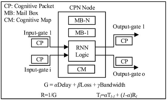 The CPN was introduced by Gelenbe et al. [33,34,35,36,37]; it has been tested in large-scale networks up to 100 nodes with worst and best case performance scenarios. The CPN assigns routing and flow control capabilities to the packets rather than the nodes (Figure 2). QoS goals are assigned to Cognitive Packets (CP) within the CPN, which they follow when making routing decisions themselves with minimum dependence on the nodes. Cognitive Packets learn from experience of other CP packets with whom they interchange network information using n Mailboxes (MB) and their own inspection about the network storing network information in their Cognitive Map (CM).