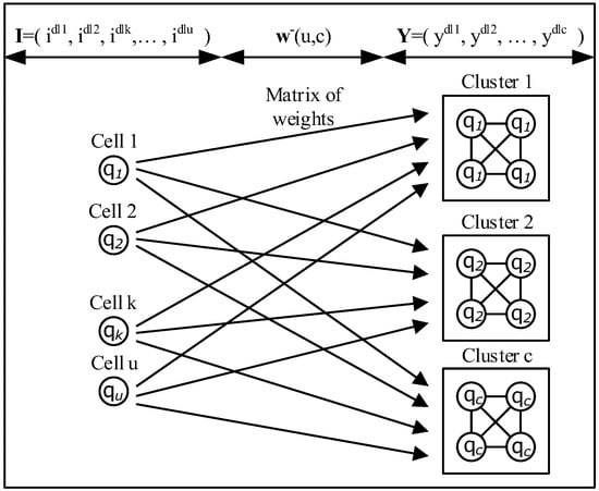 The DL Architecture is composed of C multiple clusters, each of which is made up of an M(n) cluster each with n hidden neurons (Figure 4). For the c-th such cluster, c = 1, …, C, the state of each of its identical cells is denoted by qc. In addition, there are U input cells which do not belong to these C clusters, and the state of the u-th cell u = 1, …, U is denoted by . The cluster network has U input cells and C clusters. The Deep Learning clusters model defines: