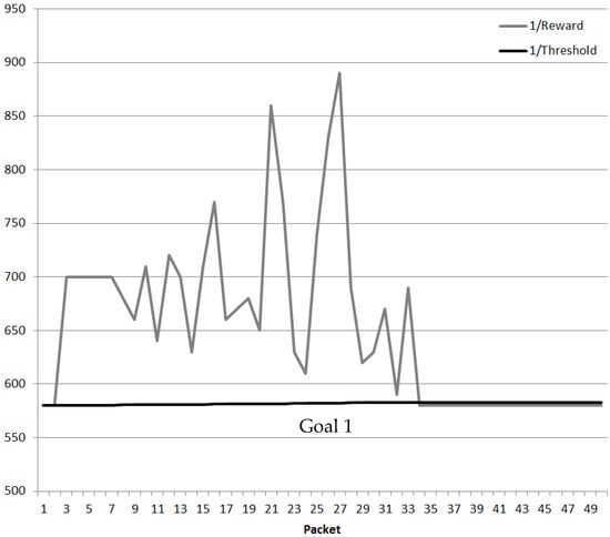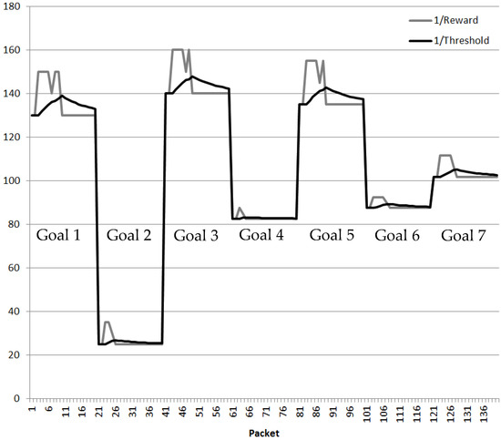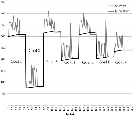 The results provided by the 4 × 4 CPN are similar to the 3 × 3 CPN. The first two packets follow the best route whereas the third packet acknowledges the QoS metrics have changed. RNN-RL finds the optimum route after Cognitive Packets explore the network and DL learns the route a Cognitive Packet after. The Reward and Threshold of route decision taken by the CEO Management Cluster when the Cyber management cluster has authorized the different Cyber keys is shown in Figure 10 for the seven different Goals. When the new best route is discovered; the CPN Threshold adapts gradually to the original value.