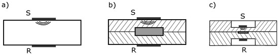 Piezoelectric discs with a diameter of 16 mm and a thickness of 0.2 mm are used for both excitation and measurement in the experiments. A one-channel pulser and receiver box (OPBOX 2.1, Optel, Wrocław, Poland) is used as impulse generator for the actuation piezoceramic. The signal generated by the receiving piezoceramic is measured using a digital oscilloscope (Picoscope 5442A, Pico Technology, Cambridgeshire, UK). The maximum achievable time resolution of 4 ns is used for data acquisition. For the analysis of the received signal, a dedicated Python script automatically calculates the time-of-flight and amplitude attenuation. The exact methods for signal analysis are discussed in Section 3. The Measurement chain is summarized schematically in Figure 2.