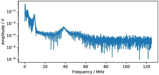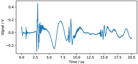 In order to test and validate the described measurement chain, experiments were carried out on a monolithic piece of aluminum with a thickness of 18 mm as shown in Figure 3a. Two piezoceramics are mounted on opposite sides. Taking into account the fact that literature values for the longitudinal speed of sound in aluminum are generally around 6300 , 18 should be passed in approximately . Figure 4 and Figure 5 show typical results of the time data and the frequency spectrum acquired in this experiment. At t = 0, the transmitter pulse is triggered on its falling edge. A significant signal amplitude is observed at the beginning of the measurement. This cannot be attributed to a mechanical wave, as a signal delay of would be expected. The phenomenon is due to the fact that both grounding planes of the piezoceramics are connected to the aluminum tool. Thus, electrical effects can interfere with the measurement immediately after a strong electrical impulse has been generated. Since this effect is not the aim of the study, such initial effects are neglected in the evaluations. After about , another pattern is measured that resembles a typical exponential decay curve. The occurrence of this pattern is due to uninsulated electric cables and is also filtered out. After approximately , a reproducible peak in the signal is measured. This value seems to be in reasonably good agreement to the literature value of .