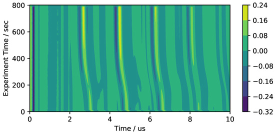 The results of this experiment are visualized with the contour plot displayed in Figure 6. The x-axis shows the individual run time after the excitation pulse is triggered. The y-axis shows the experiment time after the mould is closed. The voltage generated by the piezoceramic is visualized by the different colors. Time shifts due to the curing epoxy can therefore be observed as an overall shift of the signal in the direction of the y-axis. This phenomenon can be easily observed in the acquired data. The first clearly shifting signal peak starts at approximately 3 at the beginning of the experiment and shifts to approximately when the epoxy is fully cured. These values seem to be in reasonably good agreement with the expected values of the first longitudinal wave traveling through the mould. It is therefore concluded that the experimental setup can be used as a tool for ultrasonic cure monitoring of thermosetting matrix systems.