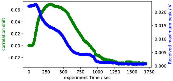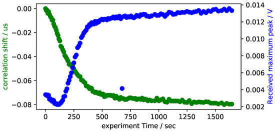 In order to clear the signal from noise, a 2nd order digital bandpass is applied with a center frequency of 10 MHz and a bandwidth of 4 MHz. These values were chosen in a way that the resonance frequency of the piezoceramic is observed. Figure 7 shows the experimental results of the correlation analysis and attenuation. The general trend is very similar to the results obtained by other researchers [11,19]. Unlike other authors, however, the time shift falls rapidly from the beginning of the experiment. This is most likely due to the time it takes to assemble the mould, which can take up to 30 after the epoxy is mixed. The epoxy is therefore already mixed for a significant fraction of the total time before the measurement started.