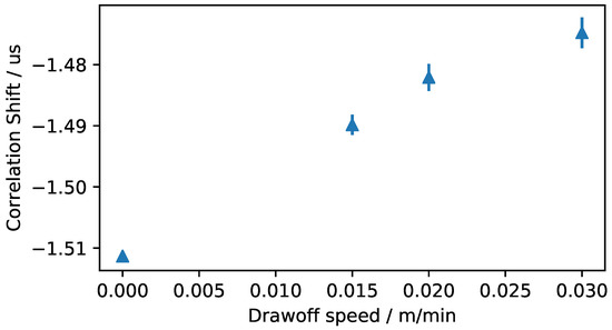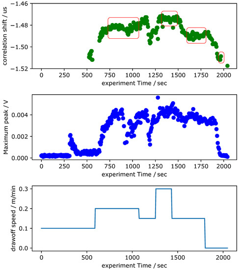 The acquired data displayed in Figure 9 shows some general trends. First of all, no coherent correlation shift is presented before 500 . The first coated fibers arrive at the sensor after approximately 300 . Between 300 and 500 , only a small signal is transmitted. The received signal is generally higher when the pull speed is large. This is coherent with the previous experiments with the RIM-epoxy system, since the epoxy under the sensor is less polymerized and therefore more signal can be transferred. The fact that the time shift is also larger for higher speeds supports the interpretation of the given data. After approximately 850 , the signal strength drops without a change in the pull speed. This could be due to insufficient impregnation of the fibers, but no definite interpretation can be presented at this point. It would be interesting, however, to further analyze this behavior and potentially exploit it to allow for a quality control. When the speed is dropped twice after approximately 1400 , both correlation shift and signal strength show a clear drop indicating that the epoxy under the sensor is becoming more and more polymerized. The dependency of correlation shift signal and and pull speed is displayed in Figure 11. When the pull speed of the pultrusion changes, the signal propagation time does not change immediately because an epoxy volume that has not yet reached the sensor has cured under two different pull speeds. A steady state can only be achieved if an epoxy volume has been cured at a constant pull speed. Figure 11 therefore shows the mean value and standard deviation of the steady state correlation shifts for different pull speeds. The time segments interpreted as steady state are marked in Figure 9 in red boxes. Figure 11 clearly shows that the signal propagation time increases with increasing pull speed. This observation is regarded as evidence of the ability to monitor epoxy curing in the pultrusion process by analyzing the time of flight of a mechanical wave. The signal attenuation characteristics measured in this experiment show a much weaker correlation to the pull speed and are therefore not recommended to be used for cure monitoring in pultrusion at this point.