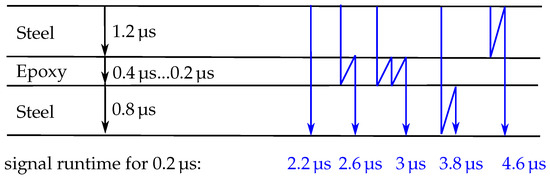 Subsequent experiments are conducted on an experimental tool, where pure epoxy with a cross section of 2 mm × 20 mm is cured between two 5 mm thick aluminum pieces. The speed of sound for longitudinal waves within a typical epoxy rises during polymerization from values in the range of 1500–2100 , as reported in [17]. A simple calculation gives an expected time-of-flight between and . For the baseline experiments, a fast curing epoxy (5 min epoxy R&G) was mixed in a volume ratio of 1:1 and cured within the test mould at room temperature.