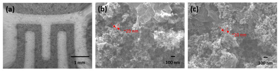 The morphology of the hybridized GO nanoflakes and TiO2 nanoparticles was observed by SEM. Figure 1a shows the dried film of the GO/TiO2 composite after drop casting onto the sensor platform of the polyimide film. The two mixed materials uniformly filled up the gap of the interdigitated electrode. In a magnified view of Figure 1b, it is observed that GO nanoflakes and TiO2 nanoparticles were tangled. The size of TiO2 nanoparticles was confirmed to be around 20 nm. The wrinkled morphology of GO sheets was due to sp3 bonding of the oxygen-containing groups on the GO surface. Figure 1c shows the magnified view of GO/TiO2 composite film after 2 h UV treatment in solution. The randomly mixed GO nanoflakes and TiO2 particles from UV-treated composite showed similar morphology with the sample before UV irradiation. When GO is coupled with TiO2, the carboxyl group on the GO surface could bond with the hydroxyl group on the TiO2 surface, and the charge transfer under UV irradiation could result in photoreduction of GO [27]. The combination of GO and TiO2 was sustained after UV irradiation, which suggests that the coupled structure is unaffected by UV energy [28]. Besides, the size of TiO2 nanoparticles had not grown or congregated, which is usually observed by heat processes [29].