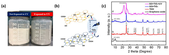 (a) The photograph of GO/TiO2 composite before and after UV exposure. (b) The schematic diagram of GO/TiO2 composite under the UV effect. (c) XRD spectra of the prepared (a) GO, (b) TiO2, GO/TiO2 composite (c) before, and (d) after UV exposure.