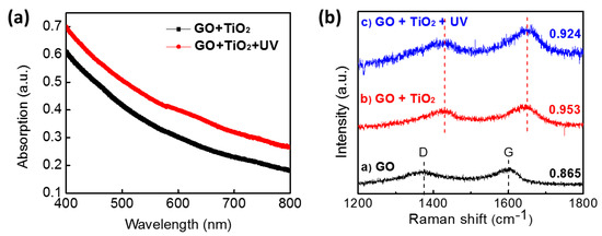 UV-visible (UV-vis) spectroscopy and Raman were employed to further investigate the effect of UV by characterizing of the composite. Figure 3 depicts the UV-vis spectra of the composite with the absence and presence of UV irradiation in the range of 400 to 800 nm. For both samples, UV absorption was decreased as the wavelength increased. With UV-treated solution, absorption spectra were generally increased in the whole range. This indicates that the electronic conjugation was restored in the graphene sheet, which corresponds to the color change of the sample where UV-treated composite looked darker in Figure 2a. Figure 3b shows the Raman spectra of (a) GO, (b) GO/TiO2 composite, and (c) GO/TiO2 composite after UV irradiation. Raman spectroscopy can reveal information regarding the local structure of the composite and the quality of carbon structure. The main feature in the Raman spectra of graphene composite was assigned in the D band at 1375 cm−1 and G band at 1598 cm−1 [34]. Normally, the D band corresponds to graphite structure as attributing to in-plain vibration of sp2 bonded carbon domain [35]. The G band is attributed to sp3 hybridized carbon bonds mostly due to the presence of structural defects as suggesting disordered crystalline carbon structure [36]. In this regard, the intensity ratio of the D band to the G band can describe an extension of the disorder or defects in the carbon domain. In Figure 3b, the value of ratio is 0.865 in GO, 0.953 in the composite, and 0.924 in UV-treated composite. In GO film, oxygen functional groups along with defects impute to sp3 hybridization on sp2 graphene matrix. Compared to the ratio of pure GO, the ratio of the composite increased, which indicates that the composite has more sp3 hybridized bonds. The increase might be associated with the introduction of TiO2 nanoparticles. Possibly, when incorporating GO with TiO2, some TiO2 nanoparticles might create Ti-O-C bonds in GO plain, resulting in increased ratio [36]. After UV irradiation, ratio was decreased more compared to that without UV since the sp2 bonds of GO were restored by photocatalysis of TiO2. Along with the UV-vis result, this confirmed that GO was photo-reduced by TiO2 catalysis and the surface condition of the composite was modified. Meanwhile, the peak shift of both D and G bands were obviously observed after hybridizing GO and TiO2 as shown in Figure 3b. It is indicated that a peak shift can be observed when materials are under stress and that a blue shift (higher wavenumber) can be induced by compression [23,37]. As a result, blue shift of the bands can be interpreted that carbon atoms in GO are under compression due to structural change induced by TiO2 nanoparticles [38]. Correspondingly, the length of chemical bonds in GO can be modified by adding TiO2 into GO. However, D and G band position were similarly maintained after UV treatment, which depicts no further structure change and chemical bonds.