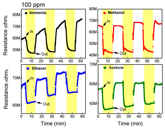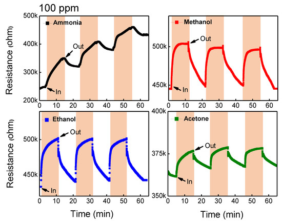 The gas-sensing properties of GO/TiO2 composite were investigated in Figure 4. This film was simply fabricated by a powder mix in the solvent without any further treatment. Various reducing gases such as ammonia, methanol, ethanol, and acetone gases were introduced with the concentration of 100 ppm, and the gas-sensing behavior of the composite was explored at RT. For the gas-sensing test, the composite film was periodically exposed to target gases for 10 min followed by a flow of ambient air where 40 sccm of nitrogen and 20 sccm oxygen were mixed. As shown in Figure 4, the initial resistance of the composite was very high, ranging from 6[WL1] 0~70 MΩ because of the insulating property of TiO2 at RT. The hybridized film exhibited n-type sensing behavior to the reducing gases. Upon introducing the target gas, the resistance of the film was dropped and then recovered to the initial resistance without the gas as showing n-type sensing behavior. Considering the RT-sensing ability of 2D nanomaterials and the insulating property of metal oxide, it is expected that GO would play a role of dominant sensing material and networking TiO2 nanoparticles [25]. On the other hand, TiO2 might play a catalytic role to attract gas molecules by lowering the activation energy [25,39]. Detecting methanol, ethanol, and acetone with high response can be attributed to the catalytic effect of TiO2, while only ammonia was identified by pure GO film.