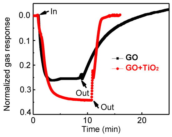 Nevertheless, the long-term stability of the composite was degraded due to susceptibility to humidity in the ambient atmosphere and high initial resistance. The large number of oxygen functional groups of GO and the oxygen adsorbates ( of TiO2 film cause dynamic interaction with humidity or contaminants, resulting in increased resistance. It has been studied that the ambient oxygen and moisture are easily absorbed on the surface of GO by oxygen functional groups, such as hydroxyl, and increase resistance [51]. Because the reactive sites become occupied by moisture under the ambient atmosphere, the function of the composite sensor cannot be maintained for a long time.