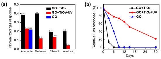 The gas-sensing performance of the hybridized samples was evaluated by incorporating the photocatalysis effect. The gas response of the GO/TiO2 composite to various gases was calculated and plotted in Figure 7a. The gas responses of the composite to ammonia, methanol, ethanol, and acetone were 0.383, 0.4, 0.18, and 0.2, respectively. These values of gas responses toward volatile organic compounds (VOCs) were higher than pure GO, rGO, and novel metal decorated rGO due to the synergistic effect of hybridization [14,44,45]. In the case of UV-treated composite, the general gas responses to reducing gases decreased to 0.2, 0.12, 0.136, and 0.041. It has been well studied that the oxygen functional groups, such as hydroxyl and epoxy groups of GO, are essential to possess high gas responses to target gases because they can easily absorb the gas molecules [12]. Since the number of oxygen functional groups on GO nanosheets were reduced from photo-reduction, the chance of interaction between functional groups and target gases was decreased resulting in a lower gas response. Although the overall gas response of the photo-reduced composite was reduced compared to pure composite, this result is quite comparable to pure GO film. Figure 7b presents the long-term stability of both composite gas sensors over a month. The GO/TiO2 composite showed a higher gas response to ammonia than the UV-treated composite, however, it maintained the function for a short time. The initial resistance of the composite sample was 70 MΩ at first and increased to over 100 MΩ after 3 days, resulting in no response to gases. The increased resistance is due to the fast oxidation of the composite as showing susceptibility to humidity. On the other hand, the UV-treated composite demonstrated that the sensor was able to work over a month at RT. Even though the response to ammonia gradually declined for a month, the response was reliable. This improvement might be due to the controlled amount of oxygen functional groups which easily reacted with water molecules in ambient atmosphere.