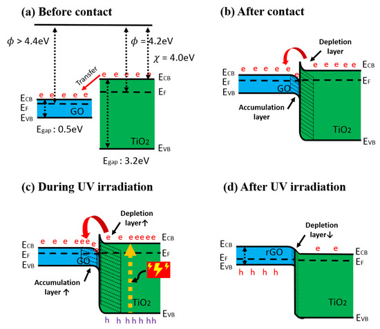 The proposed band diagram of GO/TiO2 composite (a) before contact, (b) after contact, (c) during UV irradiation, and (d) after UV irradiation. (e: electron, h: hole).