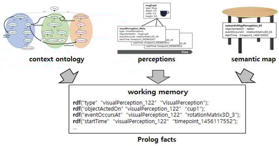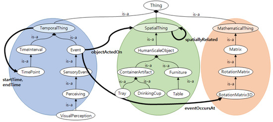 The OpenCyc [14] provides OWL-DL (a sublanguage of OWL (Web Ontology Language) based on description logic)-based upper ontology that the semantic Web community agrees on. To express knowledge about the specific domain of a robot, ORO [16] and Knowrob [17] expand the upper ontology of OpenCyc in a robot-oriented manner. ORO expands the upper ontology of OpenCyc to represent specific objects and actions that appear in scenarios, such as packing and cleaning a table. The context knowledge stored by ORO comprises spatial relations, including topological, directional, and distance relations, as well as abstracted symbolic knowledge such as visibility of agents and reachability of objects. For storing context knowledge in working memory, the triple store of OpenJena is used. The perception information collected from sensors is used for inferring context knowledge but is not stored in the working memory. For efficient management of working memory, ORO separately stores short-term, episodic, and long-term knowledge. The short-term and episodic knowledge are deleted every 10 seconds and five minutes, respectively, but the long-term knowledge is not deleted. Examples of short-term, episodic, and long-term knowledge are spatial relations, actions, and TBox, which is an ontology schema, respectively.