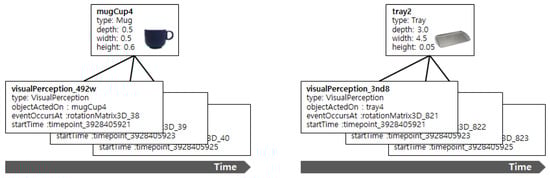 Figure 2 shows the visual perception instances of objects created by referring to the ontology in Figure 1. The box above of visual perception instances shows the basic information about each object, such as class type, depth, width, and height, which the service robot knows in advance. Then, when visual perception of the object occurs, the visual perception instances of the object (visualPerception_492w, visualPerception_3nd8, ...) are created. These instances include information about the class type (type), perceived object (objectActedOn), perceived pose of object (eventOccersAt), and perceived time (startTime). This representation method can effectively represent the spatial information of objects according to the valid time and is advantageous for building the spatio-temporal index. The center of Figure 1 shows class hierarchy and properties to represent objects in the indoor environment and the 3D spatial relations. The representative classes include container classes (ContainerArtifact), such as DrinkingGlass, Tray and furniture classes such as Table and Shelf.