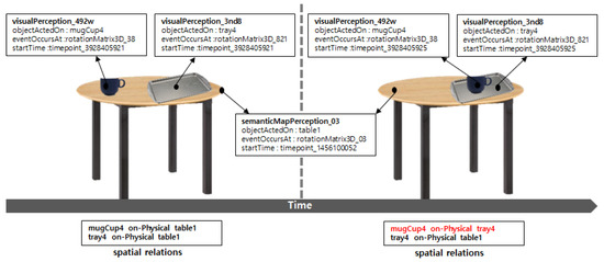 For example, as shown in Figure 15, if the context query “What is the object on table01 between 12:00 p.m. and 14:00 p.m. on 28 November 2017?” is inputted, the semantic map instance of table01 and visual perception instances of other objects whose valid time is between 12:00 p.m. and 14:00 p.m. on 28 November 2017 is queried first. Then, the spatial-relation predicate between the pose of table01 and poses of other objects is verified and the objects that satisfy this condition are retrieved again.