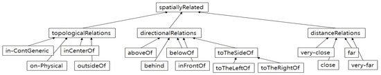 Figure 4 shows the sub-properties of the spatiallyRelated property for representing the 3D spatial relations in Figure 1. The properties of spatial relation are largely divided into topological, directional and distance relations. The topological relation properties include on-Physical, in-ContGeneric, in-CenterOf, and outsideOf, whereas the directional relation properties include toTheLeftOf, inFrontOf-Generally, and aboveOf-Generally. Finally, Distance relation properties include very-close, close, far, and very-far.