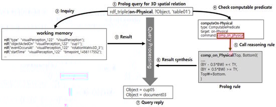 Figure 6 shows the backward reasoning method using a computable predicate [13]. As shown in this figure, when a Prolog query (rdf_triple (‘on-Physical’, ?Object, ‘table01′)) is input for 3D spatial relations, it retrieves working memory, and then checks whether on-Physical, which is the predicate of the query, is registered as the computable predicate in the context knowledge ontology. If the predicate of the query is not registered as a computable predicate, the query is processed by just retrieving the working memory through the triple pattern. However, if it is registered, not only is it retrieved, but the built-in reasoning rule is also invoked, and the result is included in the response to the query.