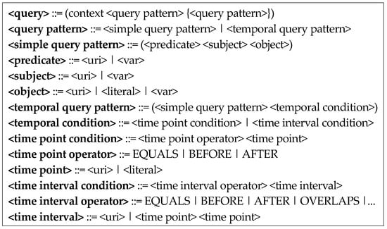This grammatical structure is interpreted as follows. A query is a repetition of a query pattern, which is either a simple or temporal query pattern. A simple query pattern is a triple format consisting of a predicate, a subject, and an object. The predicate and subject are a URI (uniform resource identifier) or variable, and the object is a URI, literal, or variable. The temporal query pattern is composed of a simple query pattern and a temporal condition, which is composed of a time-point condition and a time-interval condition. The time point condition is composed of a time-point operator and a time point. The time-point operators include EQUALS, BEFORE, and AFTER, while the time point is a URI or literal. The time-interval condition is composed of a time-interval operator and a time interval. Thirteen time-interval operators are present and are based on Allen’s theory; these include EQUALS, BEFORE, AFTER, and OVERLAPS. The time interval is a URI or consists of two time points. The grammatical structure of the context query language in Figure 7 can be used to write context queries, as shown in Figure 8, Figure 9 and Figure 10. Figure 8 shows a context query using a time-point operator.