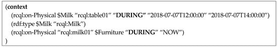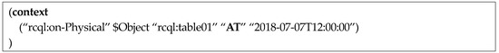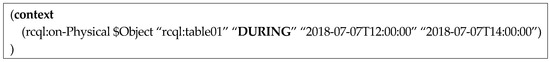 Figure 8 represents the query “What is the object on the table at 12:00?” In this example, the first three elements after the header context are a predicate (rcql:on-Physical), a subject ($Object), and an object (rcql:table01), respectively. Here, the subject is a variable. The fourth element is the time-point operator EQUAL and the last fifth element is the time literal value (2018-07-07T12:00:00), which is the operand of the time-point operator. Figure 9 illustrates a context query using a time-interval operator.