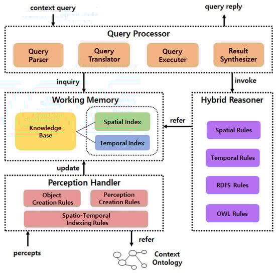 In the context query-processing system, the perception handler stores the visual perception information (percepts) received in the working memory, which is an internal storage, in real time. When storing the visual perception information in the working memory, the system refers to the context ontology and dynamically updates the spatio-temporal indices. When a context query is inputted in this situation, the query processor translates the context query into a Prolog query and retrieves context knowledge in the working memory or derives the result of the query by using the hybrid reasoner. Then, it replies the final result to the query by synthesizing these results.