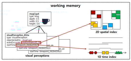 For the real-time property of the service robot, the 3D spatial relations must be quickly inferred from the visual perception instances of the objects inputted to the working memory at a rate of 10 frames per second. The largest costs in this process are the costs of accessing the visual perception instances and inferring 3D spatial relations from them. In this study, to reduce the cost of accessing the visual perception instances, as shown in Figure 12, a time index was built from the valid times of the visual perception instances, and a spatial index was built from the poses of objects to reduce the cost of inferring 3D spatial relations.